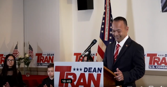 Tran drew upon his experience as a Vietnamese refugee, who was forced to flee his native country in the face of Communist aggression, to express his deep faith and commitment to American ideals. He described how his family had to sacrifice everything to come to the United States, but noted that once here, he was able to make a new start, become a contributing citizen, and raise his own family. He then introduced his wife and children, who stood by him during his address. Tran made it clear his purpose in running was to preserve the opportunities that America offered him for the next generation to come.